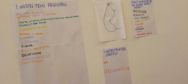 Dopo la condivisione delle esperienze, i facilitatori ci hanno divisi in gruppetti misti, in cui dovevamo rispondere ad una serie di domande, la cui risposta doveva essere unanime all’interno di ogni gruppo; a seguire, abbiamo esposto le risposte, facendo dei cartelloni