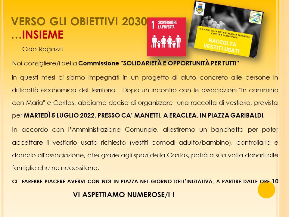 Ad inizio mandato abbiamo scelto un progetto che consisteva in una raccolta di vestiti per le famiglie bisognose di aiuto perché in difficoltà economica. Abbiamo scelto quest’idea per aiutare le famiglie del Comune di Eraclea.