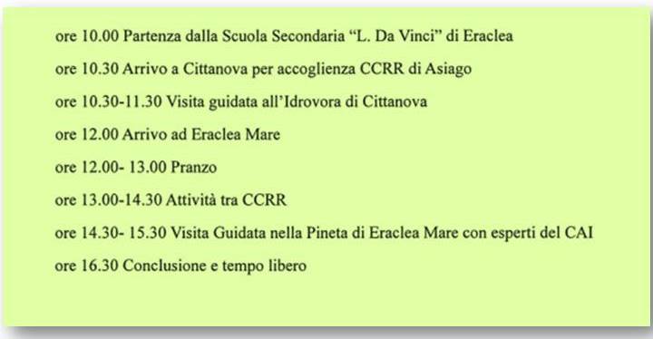 Sempre nel mese di ottobre, presumibilmente nella prima decade, i ragazzi del CCR di Asiago sono invitati a Eraclea Mare, presso il Centro Ambientale, da cui partirà l’escursione naturalistica lungo la costa e la visita un’idrovora, testimone di una storia di grande lavoro di bonifica. Seguiranno momenti di progettazione di attività comuni sugli obiettivi dell’Agenda 2030, da realizzare nelle rispettive città.