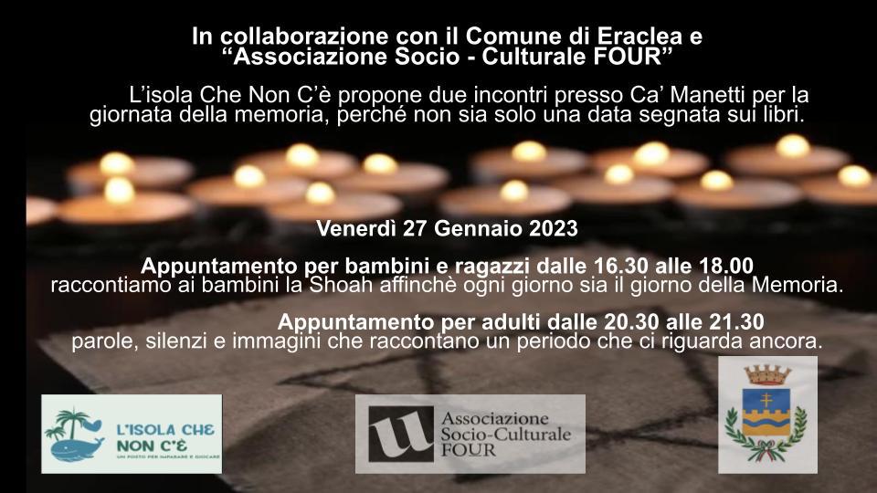 In occasione del Giorno della Memoria, l’Amministrazione Comunale di Eraclea in collaborazione con l’Associazione Socio-Culturale FOUR, invita la S.V. alla partecipazione all’incontro “Parole, Silenzi e Immagini” che raccontano un periodo che non dobbiamo dimenticare, proposto dall’Isola che Non C’è APS, presso la Sala Consiliare Cà Manetti di Eraclea Venerdì 27 gennaio alle 20.30”.